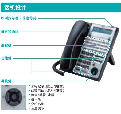 产品介绍:呼叫指示器/信息等待;可更换面板;24个编程键。具有:功能键,导航键,来电记录;已拔电话记录;检查/编辑、速拔;通讯录;分机名称;音量调节。